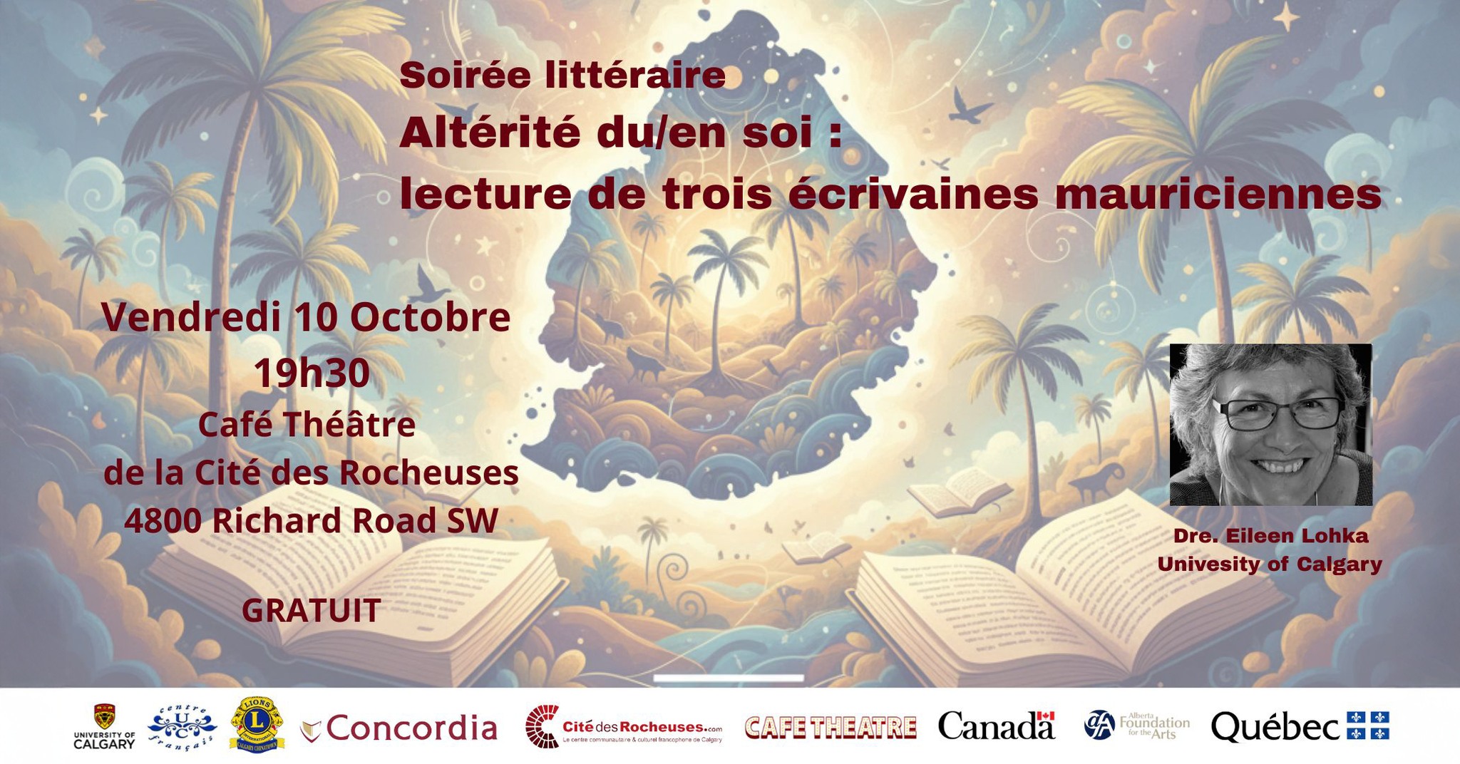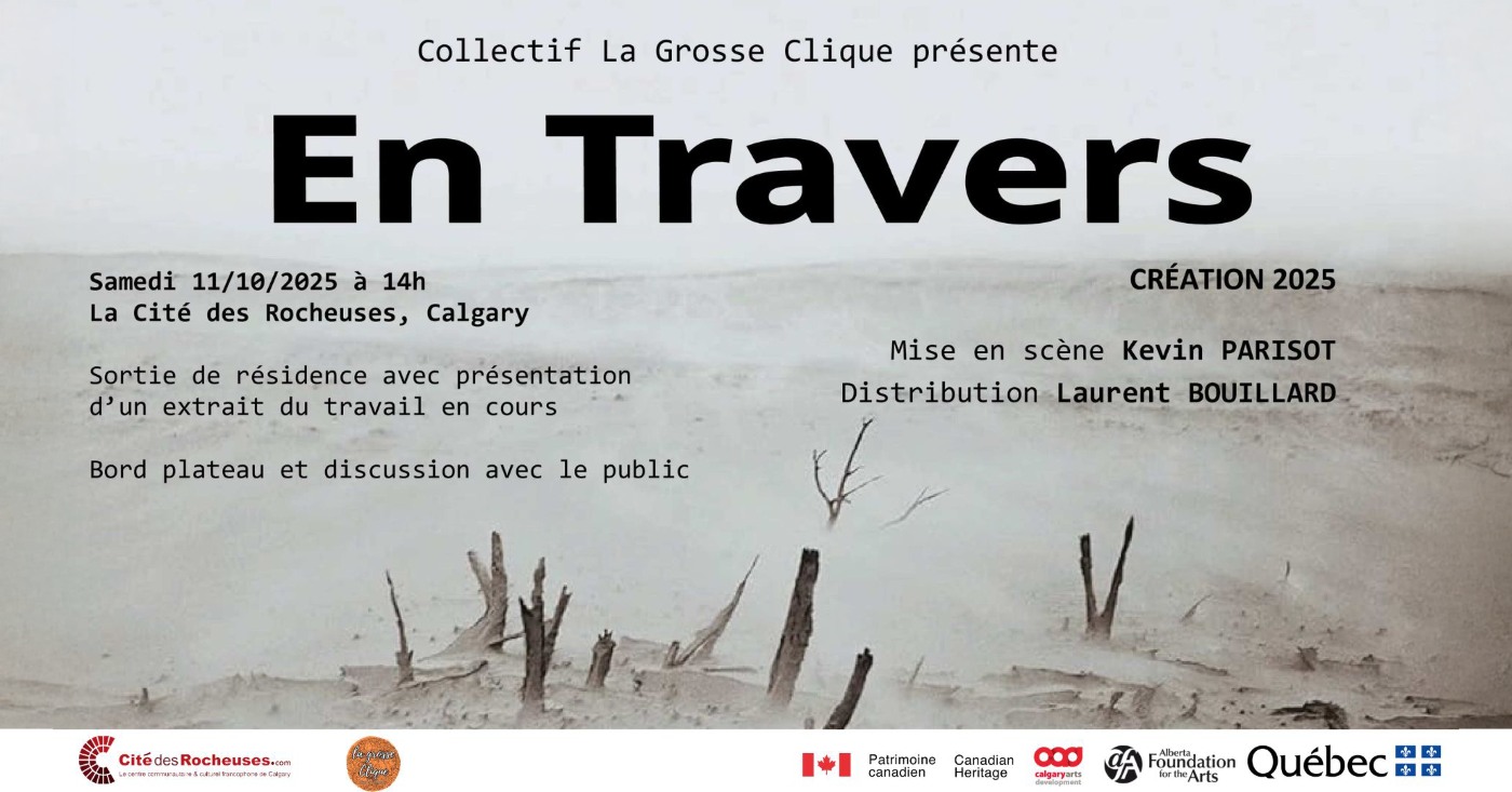 Nos événements passés Cinéma : Moon le Panda / Moon the PandaDate:Sep 13Horaires:15:00 - 16:30Lieu: Théâtre de la Cité des RocheusesVoir plus Cinéma : La venue de l’avenirDate:27 septembre 2025Horaires:19:00 - 21:00Lieu: Théâtre de la Cité des RocheusesVoir plus Cinéma : CIFF : FOLICHONNERIESDate:27 septembre 2025Horaires:21:30Lieu: Cineplex CF CHINOOK CENTREVoir plus Créons ensemble en français : Ateliers et expositionDate:Oct 1Horaires:18:00 - 20:00Lieu: Théâtre de la Cité des RocheusesVoir plus Rencontre : Jeromy FarkasDate:5 octobre 2025Horaires:17:00 - 18:00Lieu: Théâtre de la Cité des RocheusesVoir plus Pub Night au Café Théâtre !Date:9 octobre 2025Horaires:18:00 - 21:00Lieu: Théâtre de la Cité des RocheusesVoir plus Conférence : Repenser l’identité en traductionDate:10 octobre 2025Horaires:18:00 - 19:00Lieu: Théâtre de la Cité des RocheusesVoir plus Soirée littéraire : Altérité du/en soiDate:10 octobre 2025Horaires:19:30 - 20:30Lieu: Théâtre de la Cité des RocheusesVoir plus Théâtre : En travers (sortie de résidence de travail)Date:11 octobre 2025Horaires:14:00 - 15:00Lieu: Théâtre de la Cité des RocheusesVoir plus